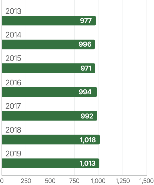 Quantity of milk used on farms that was produced in the US from 2013 to 2019 (in million pounds)*