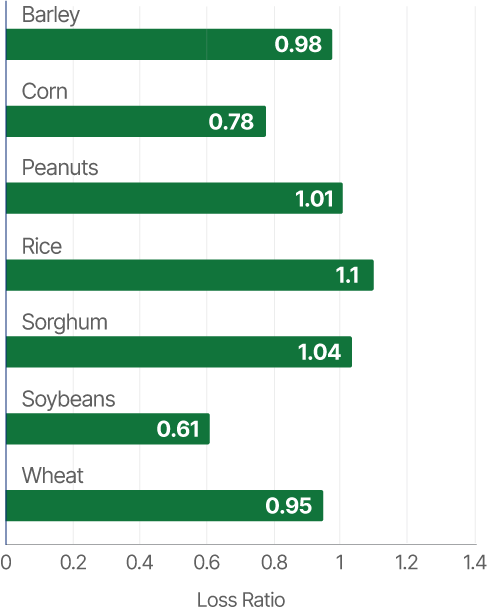 According to a recent study, the number of claims and payouts of those losses could actually save you money in the long run. What is nice about farm insurance is, yes it will cost you premium upfront, but it will save you way more than you put in when you actually have to use it. Take a look at some figures on loss ratios for US crops.